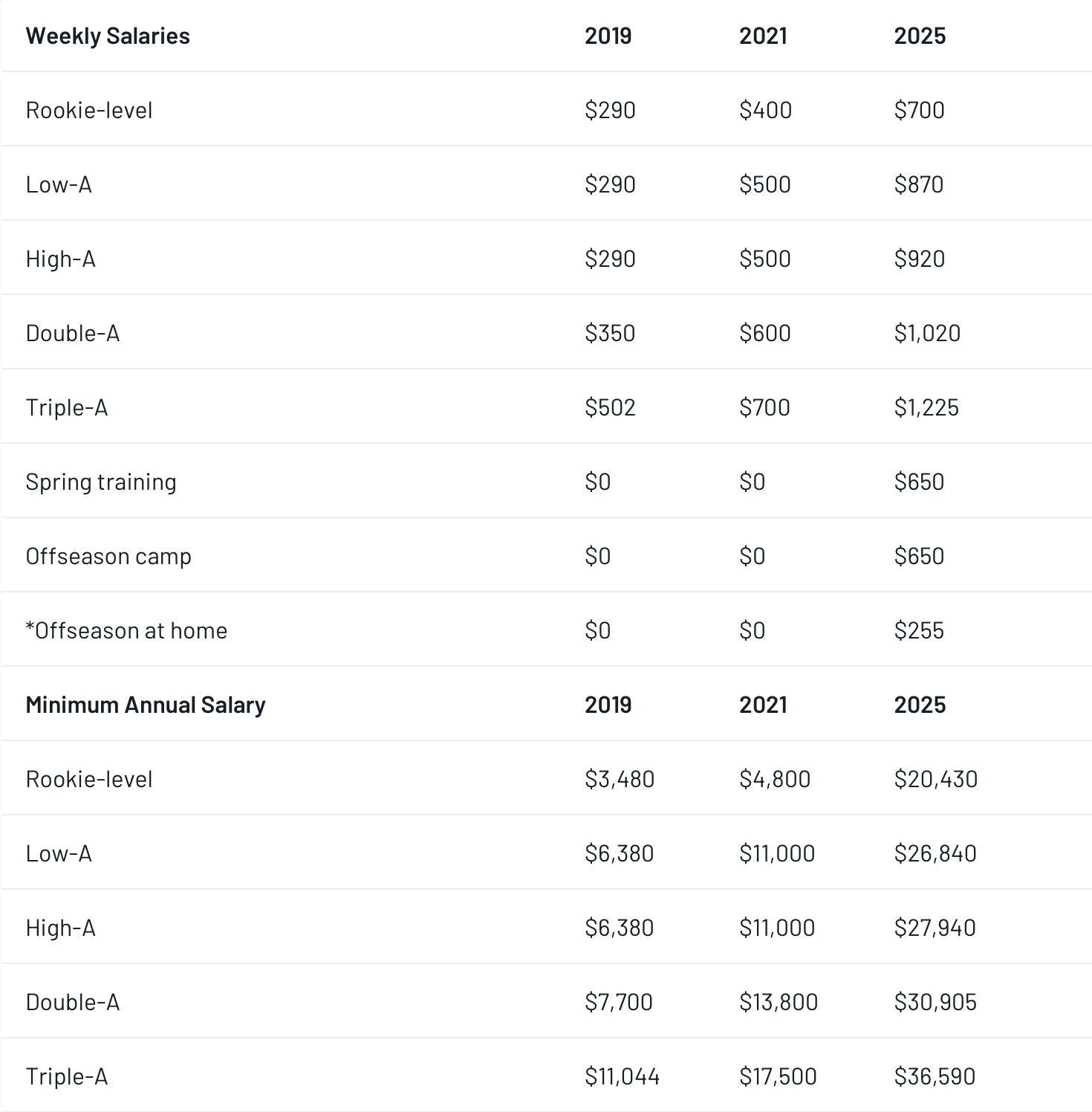 But this is an exception in scale, not in form. All professional athletes are wage laborers, like you and I. Most professional athletes earn wages that keep them housed and fed, but not much more. Take the pay of minor baseball players, compiled by Baseball America in the table below. The players had to fight for every penny.