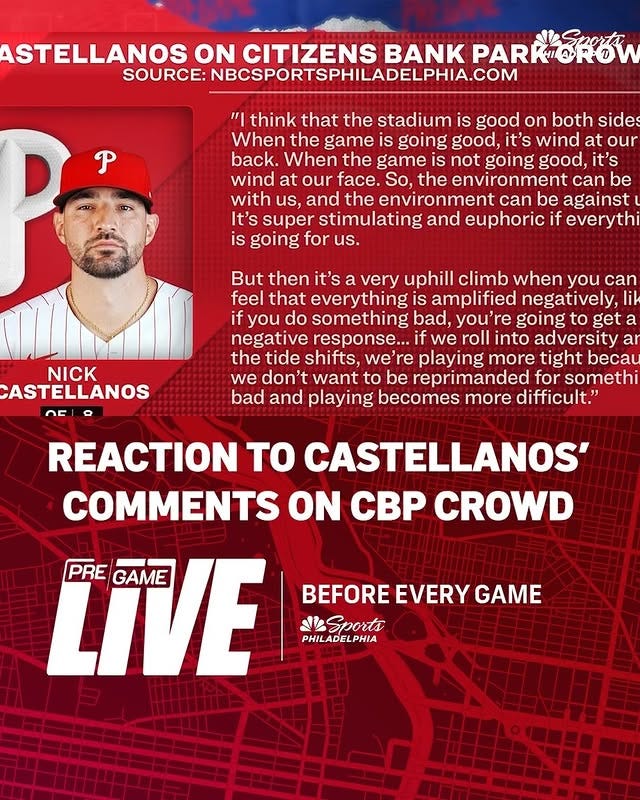 I keep falling back to the same answer: There is no point. My watching the Phillies does not at all affect the outcome (except if I wear this shirt and sit in that chair and standing in this location for the middle innings and wear that hat and…), and the team seems to not care that I watch. “I think that the stadium is good on both sides. When the game’s going good, it’s wind at our back. When the game’s not going good, it’s wind at our face,” outfielder Nick Castellanos said after the Phillies Game 2 loss. “So the environment can be with us and the environment can be against us.”